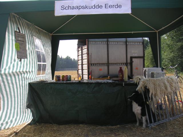 Er was een klein tentje waar je informatie over de kudde kon krijgen en waar we pittige lams-worstebroodjes (van de eigen kudde) verkochten. Kaina, het "werkhondje" van de kudde bemant even in haar eentje de stand. |
