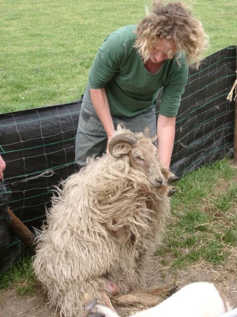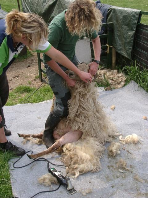 De kunst afkijken. Marit scheert vakkundig een Schoonebeeker ooi. Ziet er soepel uit... |