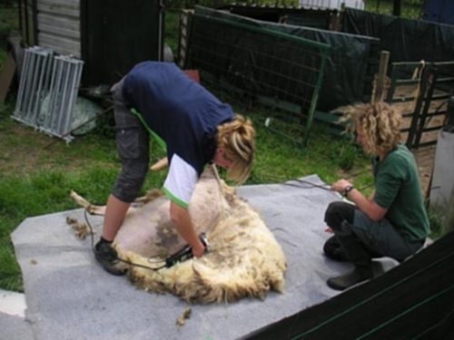 We proberen de Nieuw Zeelandse methode onder de knie te krijgen. Gewapend met boekje, scheermachine en begeleid door een instructeur die de kneepjes (en slagen) in Nieuw Zeeland leerde, gingen we aan de slag.