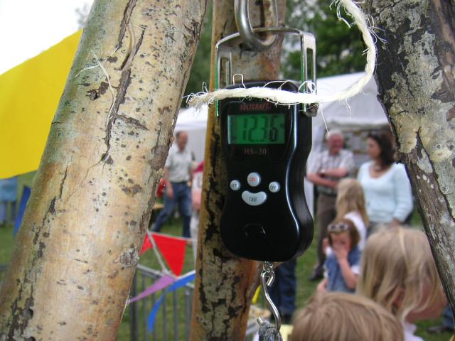 En dan hangt Daapje erin en de uitslag is: 12 kg en 360 gram!. |
