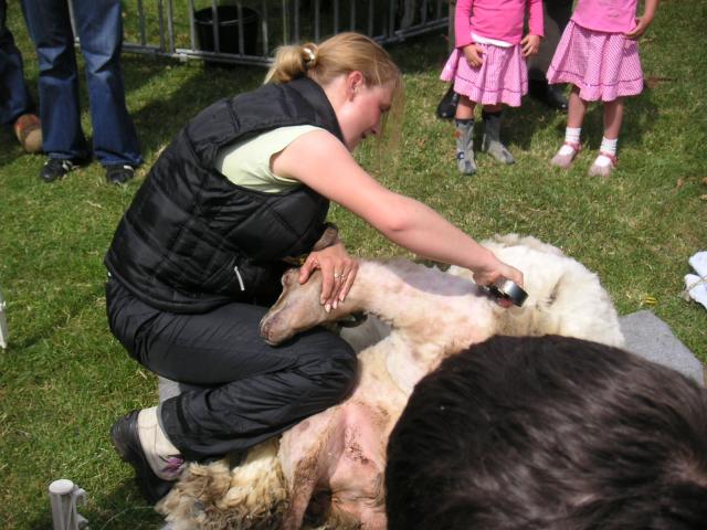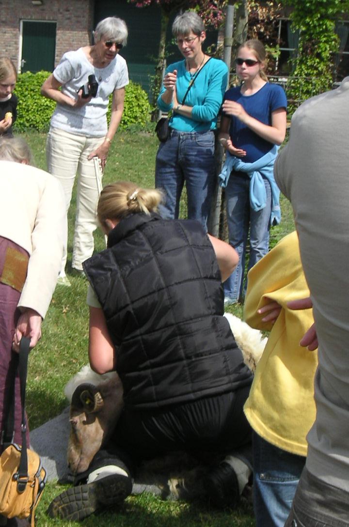 Schapen scheren zoals men dat vroeger deed met de handschaar. Inge geeft een demonstratie. |